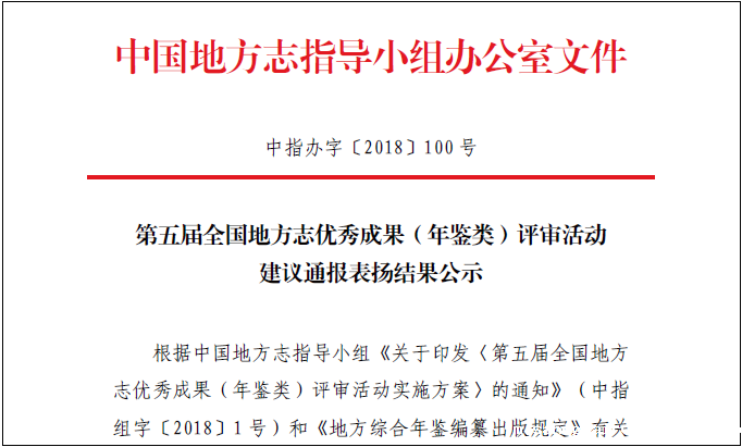 第五届全国地方志优秀成果(年鉴类)评审活动建议通报表扬结果公示
